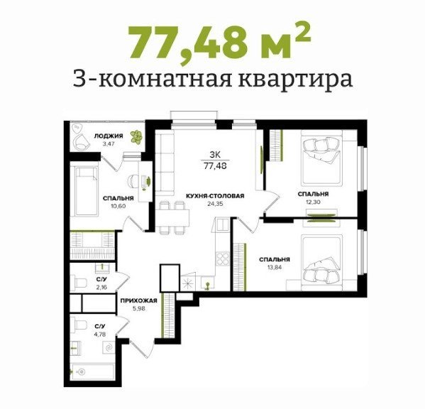 Площадь от 77.48 м2