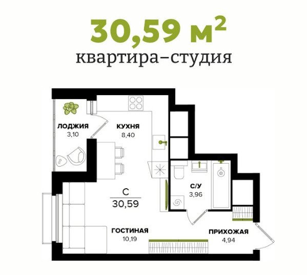 Площадь от 30.59 м2